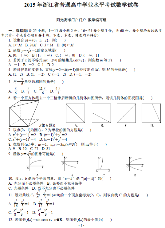 浙江省2015年1月普通高中學業(yè)水平考試數(shù)學試題及答案